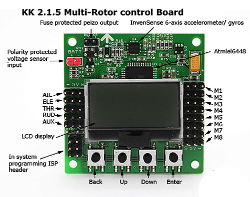 The KK2.1.5 is next big evolution of the first generation KK flight control boards. The KK2.1.5 was engineered from the ground up to bring multi-rotor flight to everyone, not just the experts. The LCD screen and built in software makes install and setup easier than ever. A host of multi-rotor craft types are pr-installed, simply select your craft type, check motor layout/propeller direction, calibrate your ESCs and radio and you’re ready to go! All of which is done with easy to follow on screen prompts.